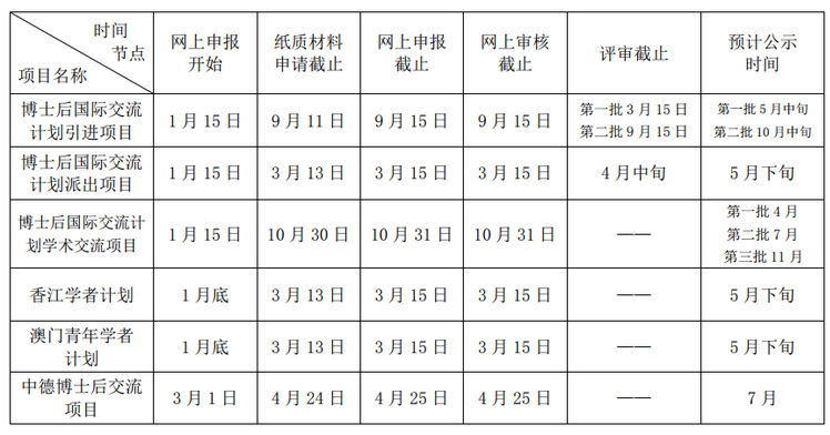 请额外注意下表中纸质材料申请截止日期。各位博士后请在纸质材料申请截止日期前将相关材料交至津南校区综合业务西楼408